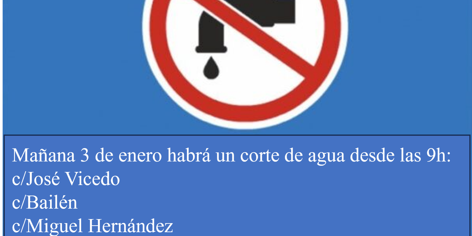 Mañana 3 de enero habrá un corte de agua desde las 9h en: c/José Vicedo c/Bailén c/Miguel Hernández Comparte esta información Share on FacebookShare on Facebook Share on XShare on X Share on WhatsAppShare on WhatsApp TweetShare on Pinterest Share on LinkedInShare on LinkedIn