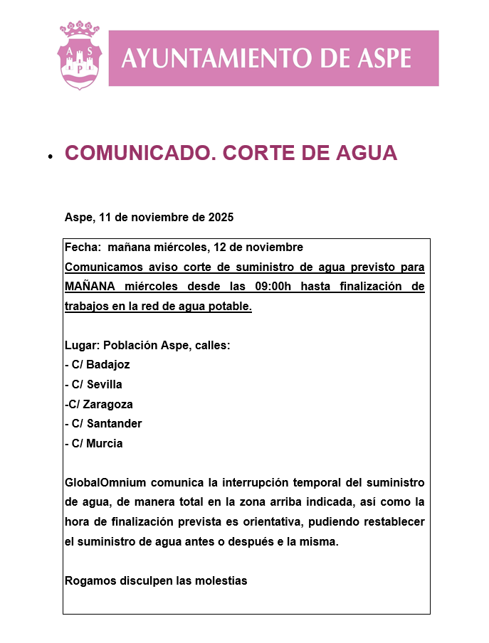 Previsto para mañana miércoles 12 de noviembre de 2025 a partir de las 09:00h. Comparte esta información Share on FacebookShare on Facebook Share on XShare on X Share on WhatsAppShare on WhatsApp TweetShare on Pinterest Share on LinkedInShare on LinkedIn