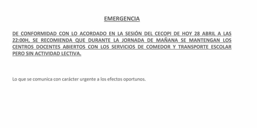 De conformidad con lo acordado en la sesión del CECOPI de hoy 28 de abril a las 22:00h, se recomienda que durante la jornada de mañana, 29 de abril, se mantengan los centros docentes abiertos con los servicios de comedor y trasporte escolar pero sin actividad lectiva.