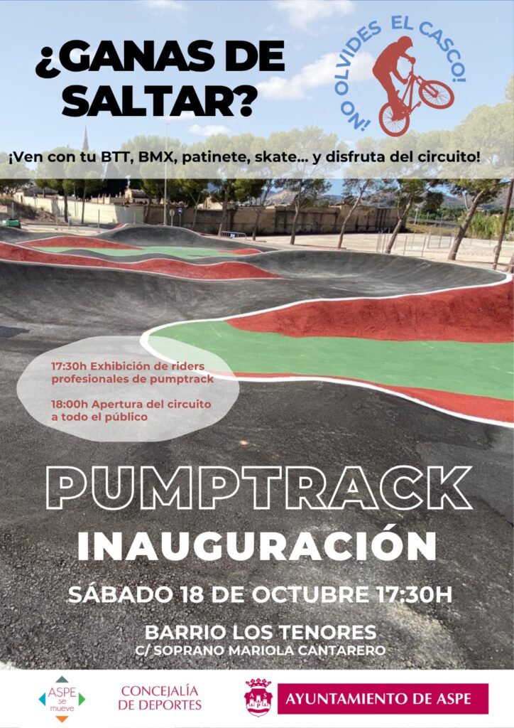 El Ayuntamiento invita a toda la ciudadanía a participar en la inauguración oficial del nuevo Pumptrack de Aspe, este sábado 18 de octubre a partir de las 17:30 horas, y disfrutar de una tarde de deporte, diversión y convivencia.