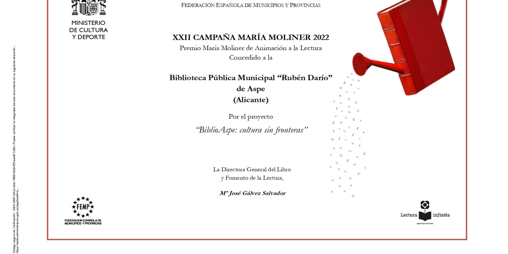 La Biblioteca Rubén Darío de Aspe ha recibido el diploma correspondiente al Premio María Moliner de Animación a la Lectura concedido por el Ministerio de Cultura y Deporte y la Federación Española de Municipios y Provincias.