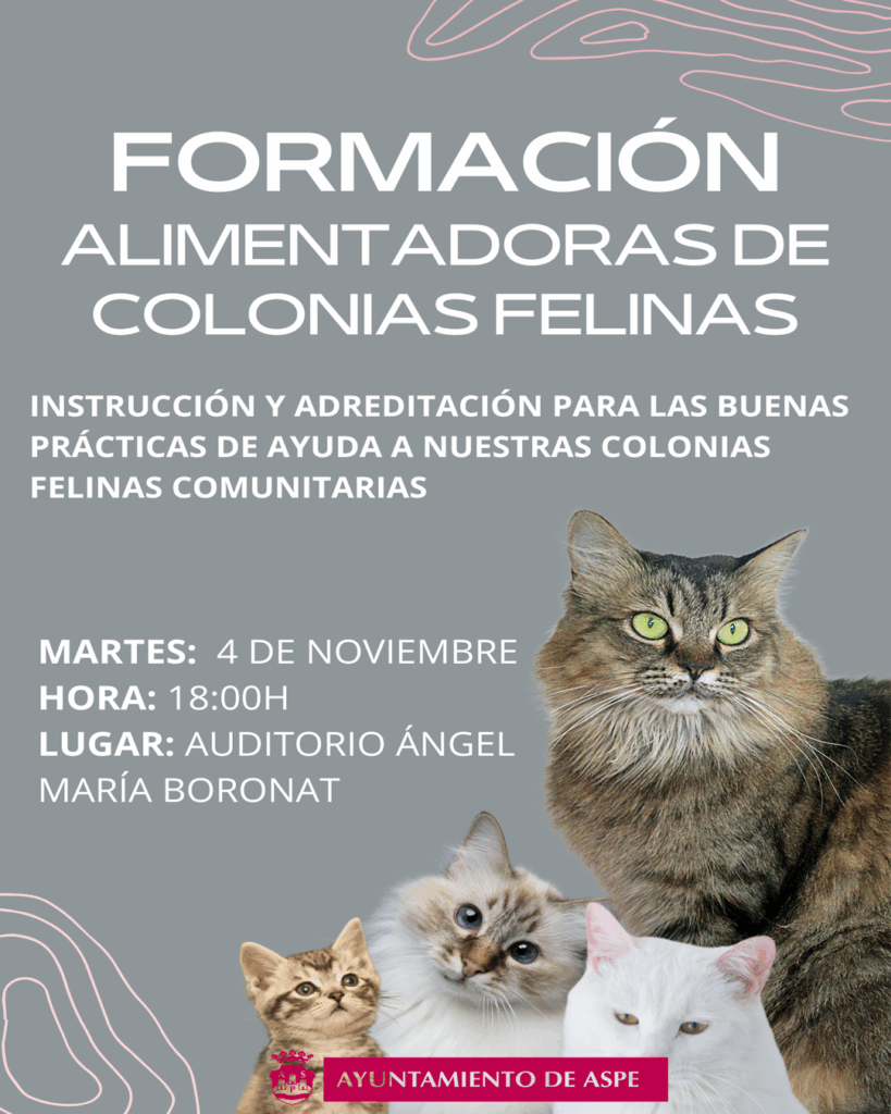 La Concejalía de Bienestar y Convivencia Animal del Ayuntamiento de Aspe ha anunciado la puesta en marcha de una formación dirigida a personas colaboradoras y voluntarias encargadas de la alimentación de colonias felinas, que tendrá lugar el próximo 4 de noviembre.