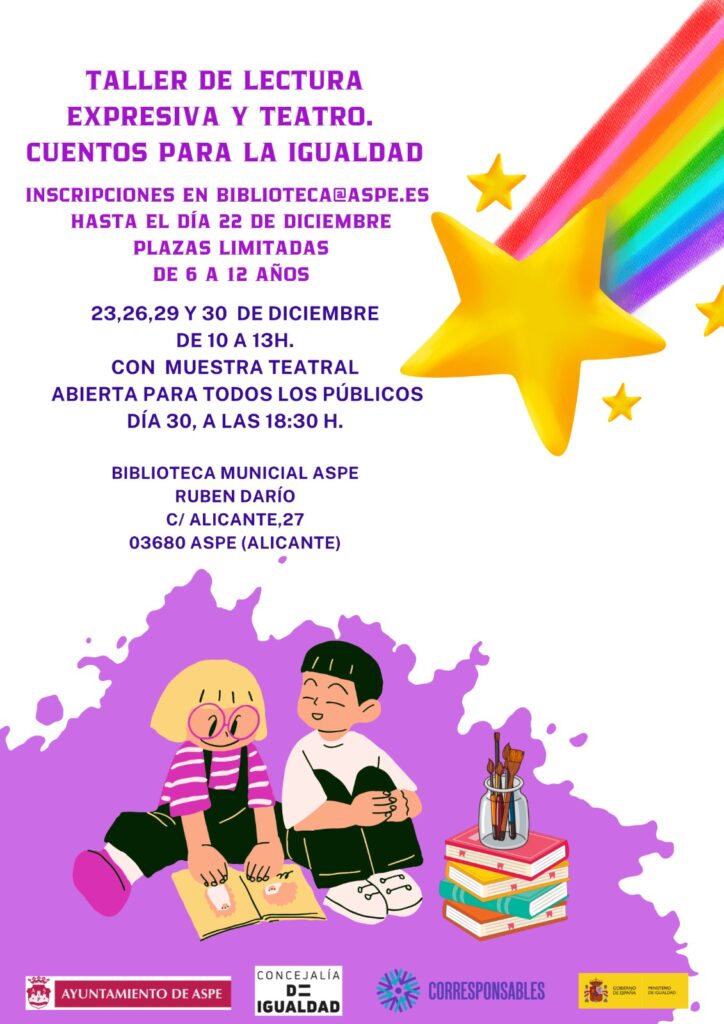 La Concejalía de Igualdad del Ayuntamiento de Aspe pone en marcha, un año más con motivo de las fiestas navideñas, el Taller de Lectura Expresiva y Teatro dirigido a niñas y niños de entre 6 y 12 años.
