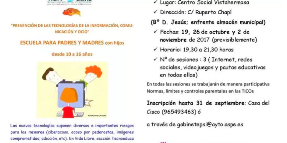 La concejalía de Educación ha programado para octubre y noviembre una serie de charlas orientadas a facilitar a madres y padres, pautas y estrategias educativas eficaces para prevenir los problemas derivados del mal uso de las tecnologías de la Información, comunicación y ocio, TICOS, de sus hijos.