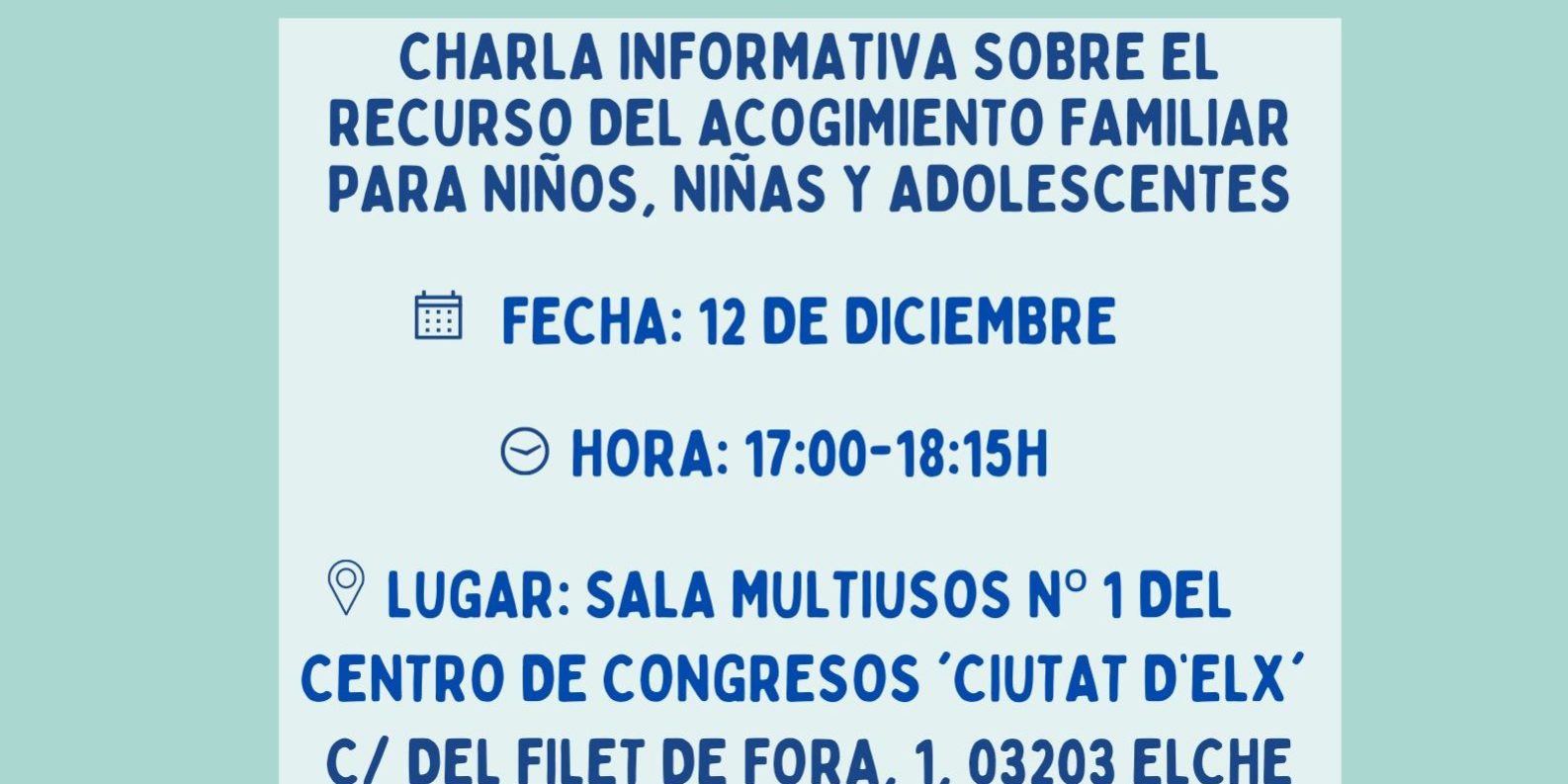 Si estás interesado en conocer más sobre el recurso y cuáles son los pasos para ofrecerte como persona acogedora, los técnicos de la Dirección Territorial de Alicante realizarán una CHARLA INFORMATIVA EXTRAORDINARIA EN ELCHE.