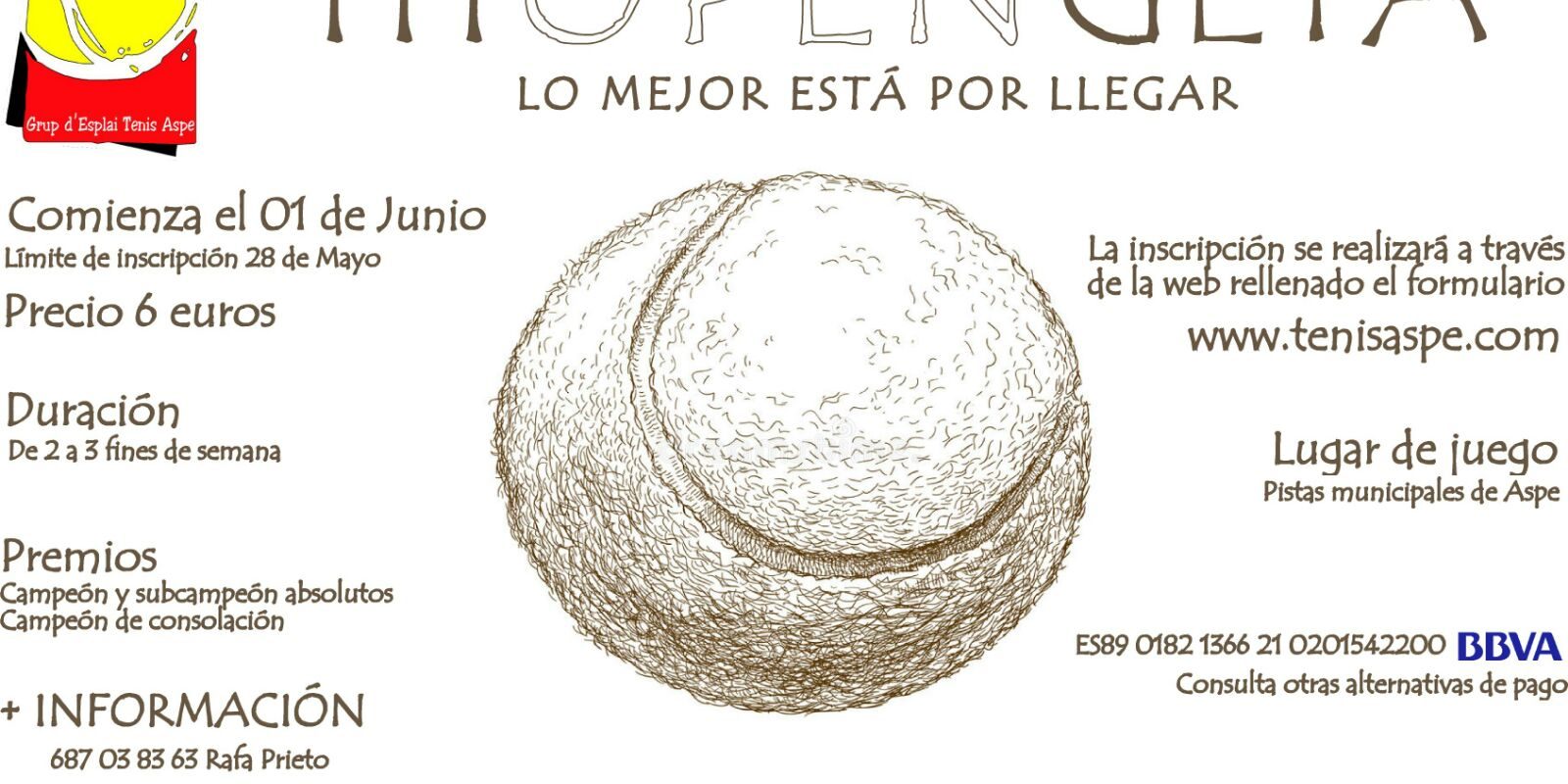 El Grup d’Esplai Tenis Aspe (G.E.T.A.), en colaboración con la Concejalía de Deportes del Ayuntamiento de Aspe, organiza un nuevo torneo de tenis durante el próximo mes de junio en las pistas municipales. Se trata de la tercera edición del Open G.E.T.A, competición individual con posibilidad de inscripción abierta para la participación de cualquier jugador amateur de la disciplina de la raqueta.