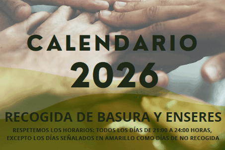 La concejalía de Servicios Municipales y Medio Ambiente ha publicado el calendario de recogida de basuras 2026. El documento ya puede descargarse haciendo click aquí. En formato papel si no ha llegado a tu domicilio, podrá recogerse en el Punto de Información del Ayuntamiento y en la Agencia de Desarrollo Local. El objetivo de todas…