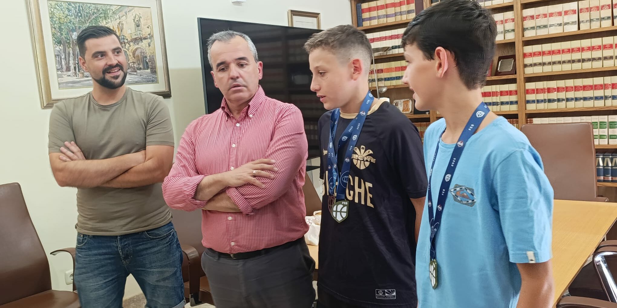 El alcalde de Aspe, Antonio Puerto, junto al concejal de Deportes, Daniel Aguilar Puche, ha recibido esta mañana en el Ayuntamiento a Aníbal Botella Sánchez y Mario Marcos Bonmatí, dos jóvenes aspenses jugadores alevines que están destacando en el panorama nacional de baloncesto como parte del equipo CBI Elche.