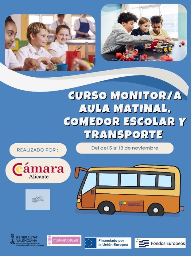 - CURSO MONITOR/A AULA MATINAL, COMEDOR ESCOLAR Y TRANSPORTE”, llevado a cabo por la Cámara Oficial de Comercio, Industria, Navegación y Servicios de Alicante, con una duración de 50 horas que finalizó el día 18 de noviembre de 2025.