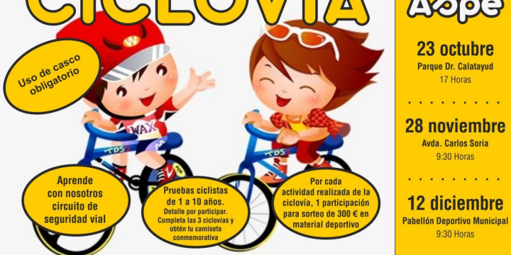 Este sábado, 23 de octubre, vuelve la ciclovía a las calles de Aspe. La primera edición de 2021 tendrá lugar en el Parque Doctor Calatayud, a partir de las cinco de la tarde, dentro de las actividades programadas por el Ayuntamiento de Aspe con motivo de la Semana de la Salud. Las siguientes ciclovías serán los domingos 28 de noviembre, en la Avenida Carlos Soria y 12 de diciembre, en el Pabellón Deportivo Municipal, comenzando ambas a las nueve y media de la mañana.