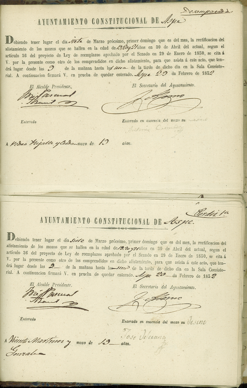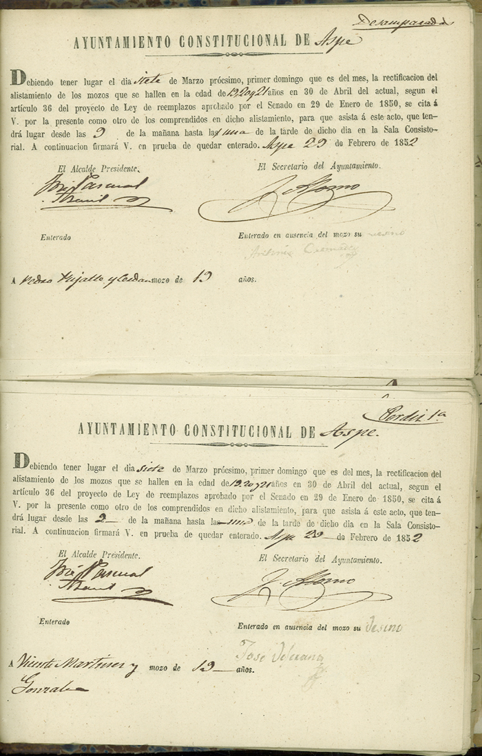 Actas de Alistamiento, 1852.