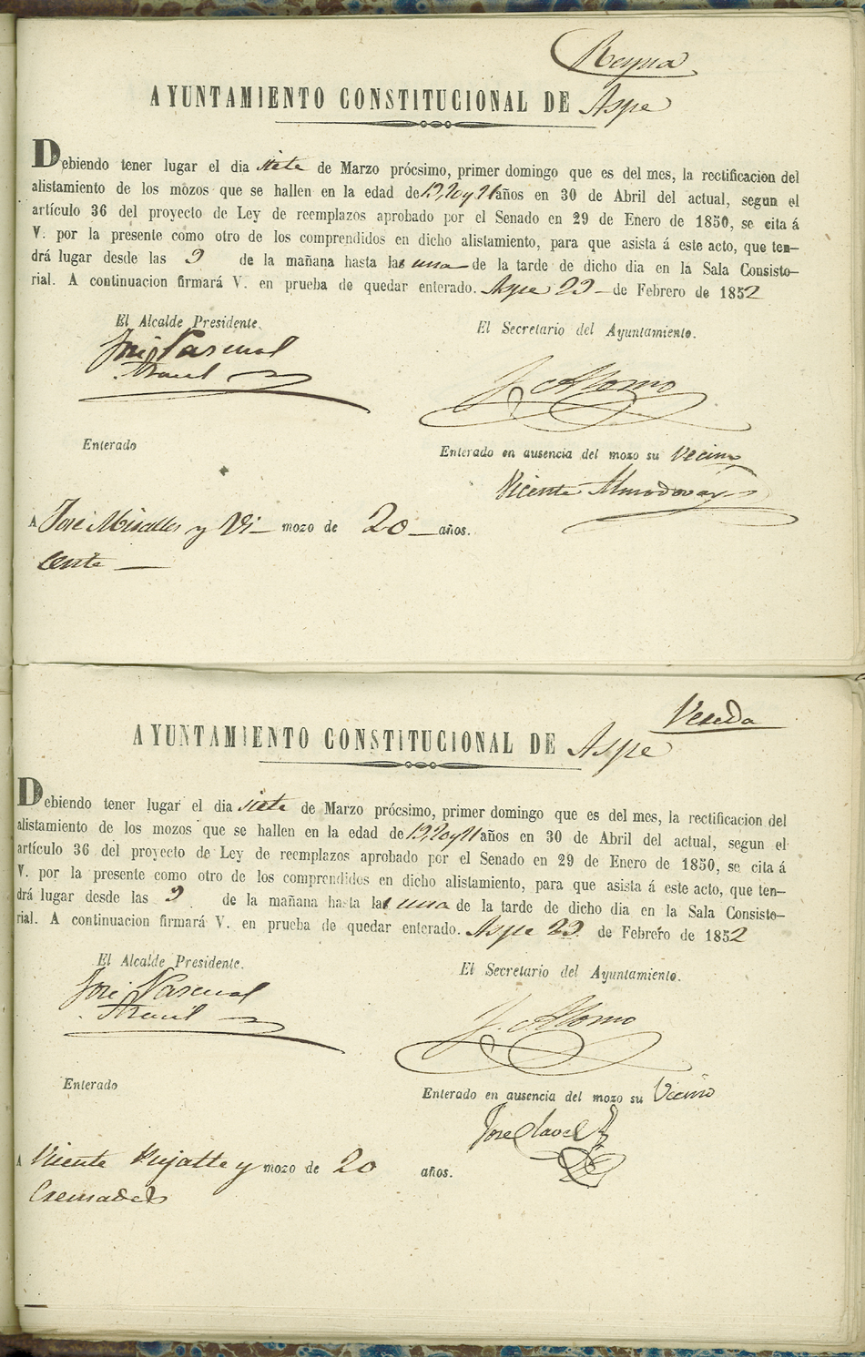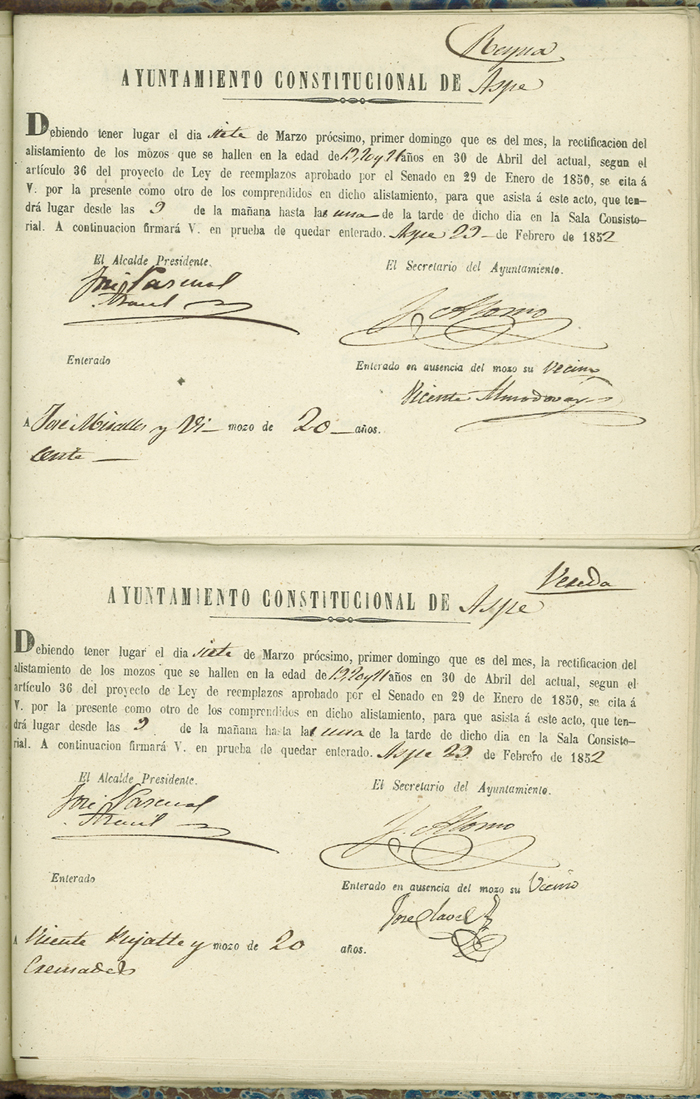 Actas de Alistamiento, 1852.