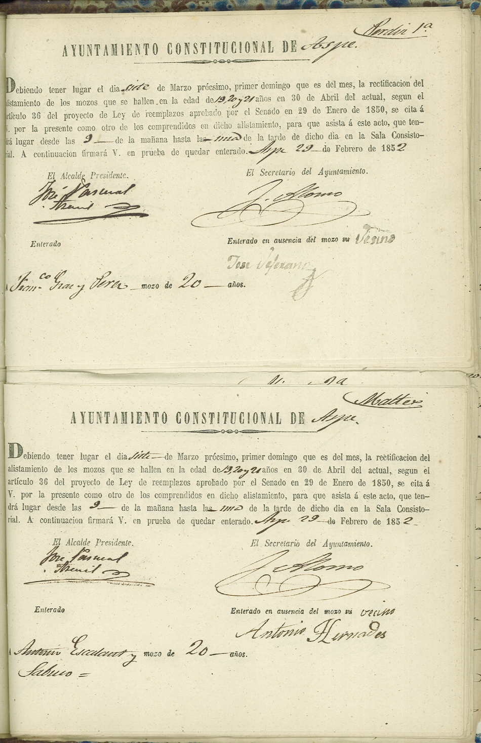 Actas de Alistamiento, 1852.