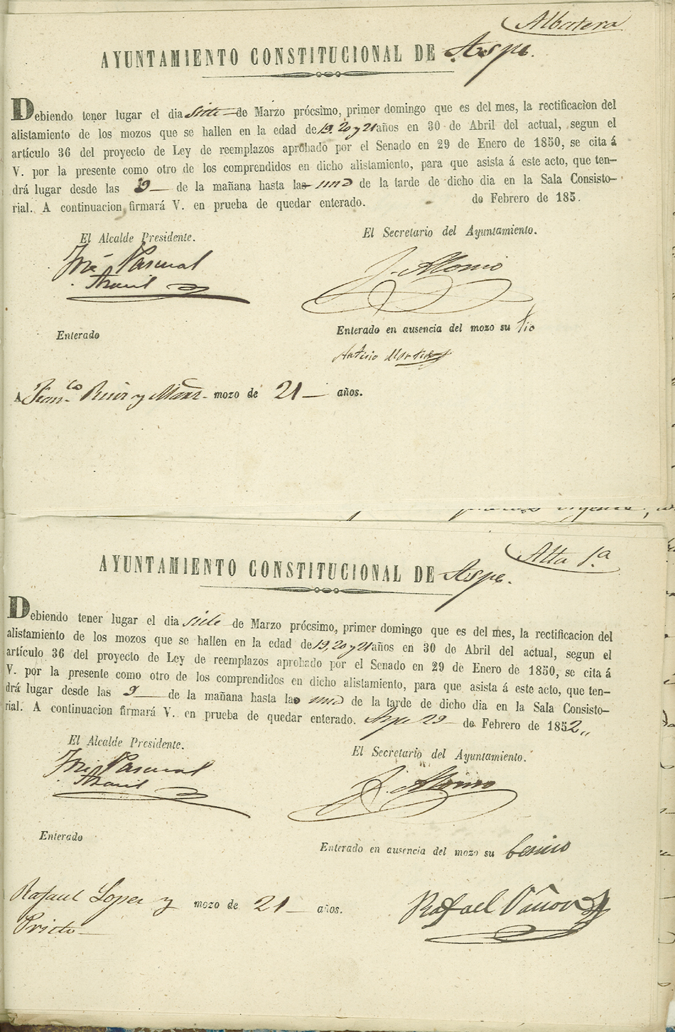 Actas de Alistamiento, 1852.