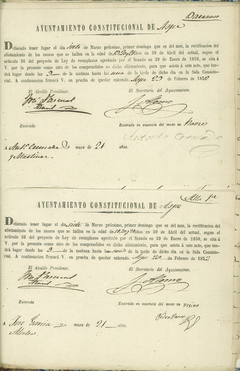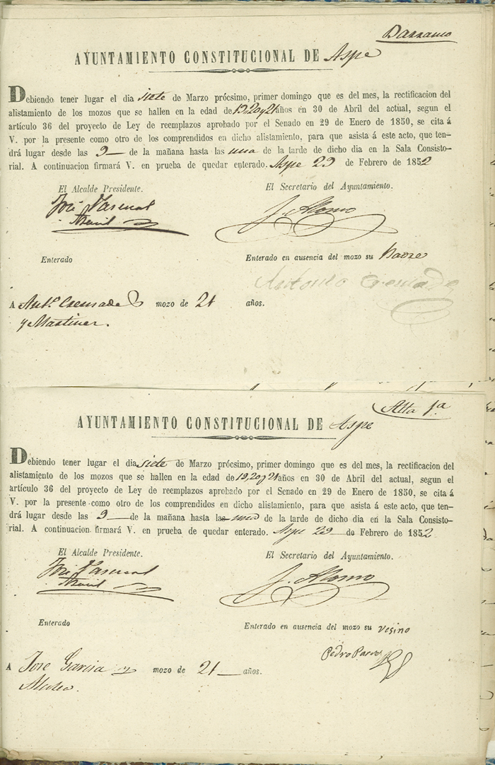 Actas de Alistamiento, 1852.