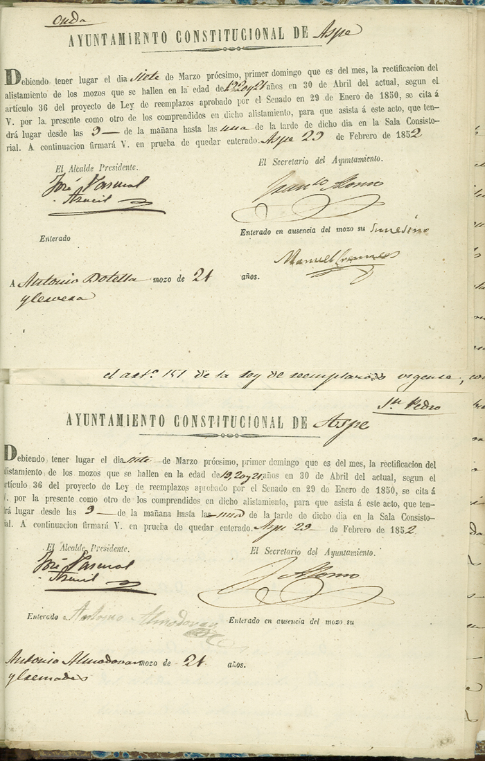 Actas de Alistamiento, 1852.
