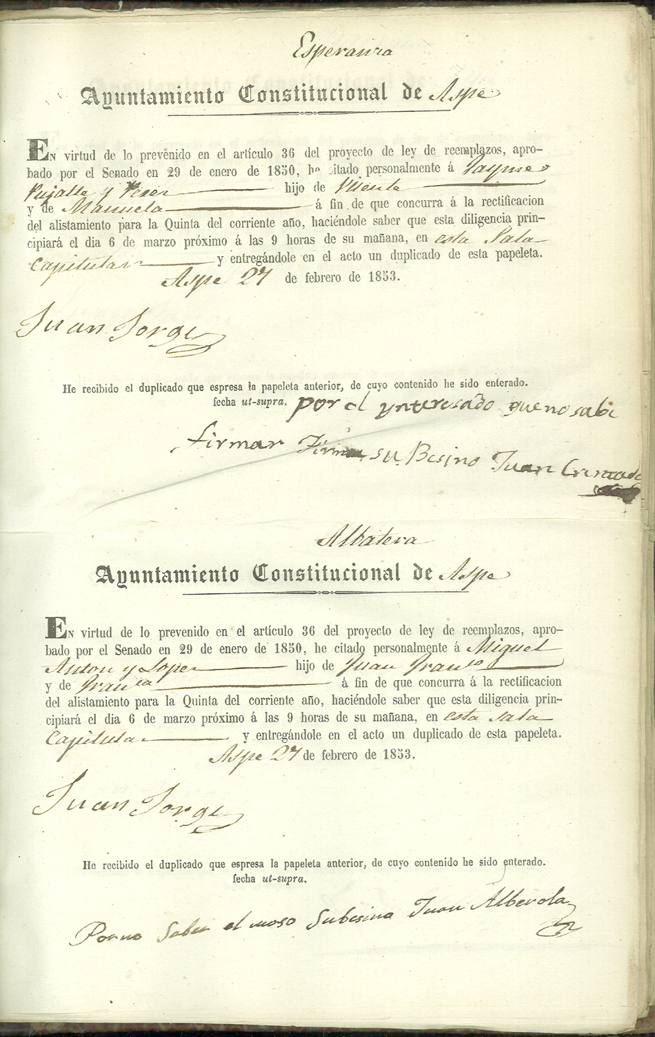 Actas de Alistamiento, 1853