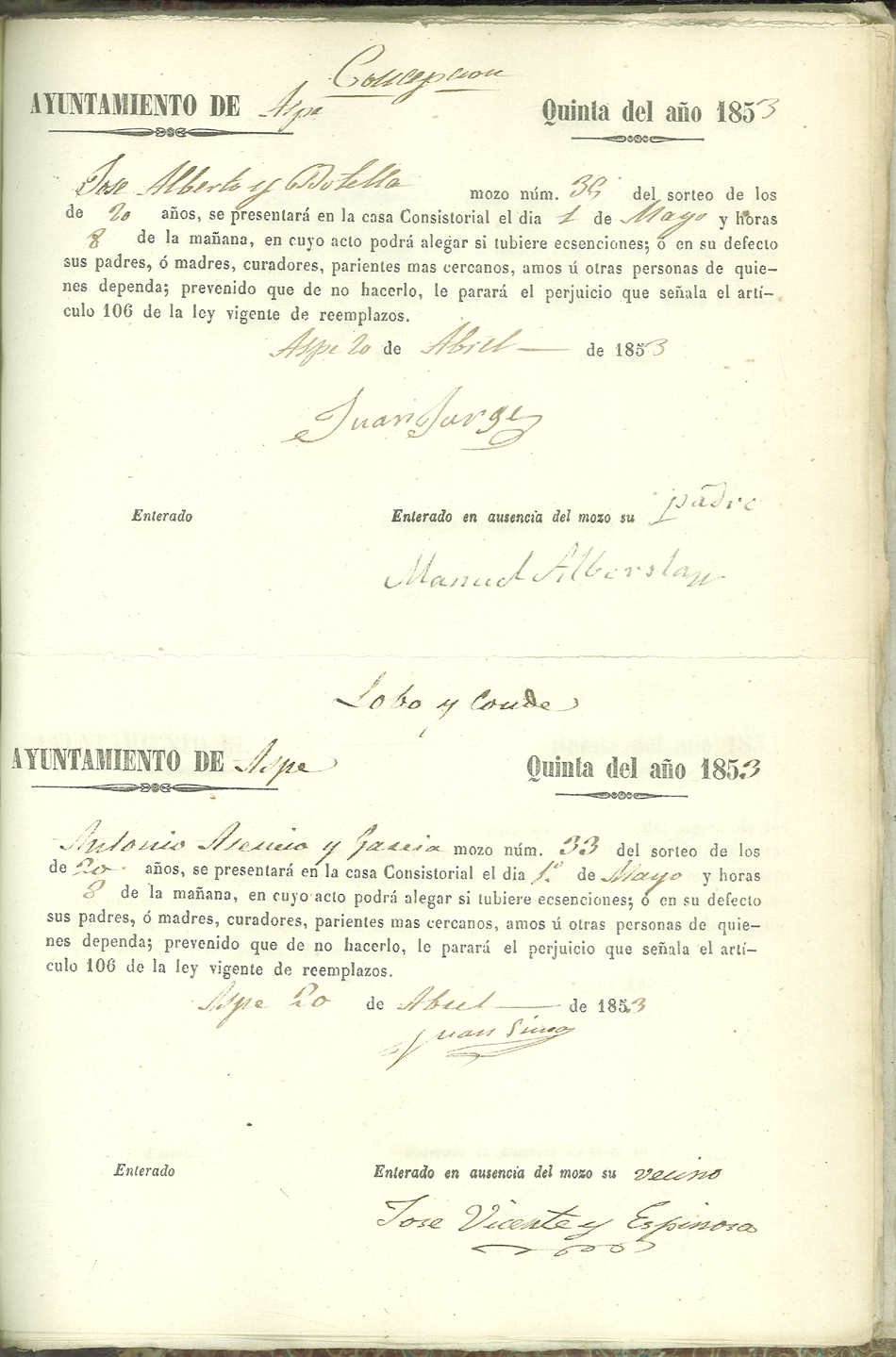 Actas de Alistamiento, 1853