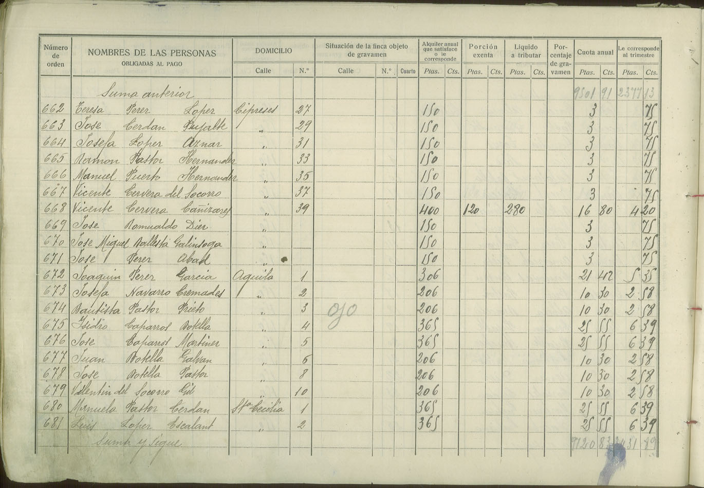 Padrón de personas sujetas al pago de arbitrio de inquilinato, 1927