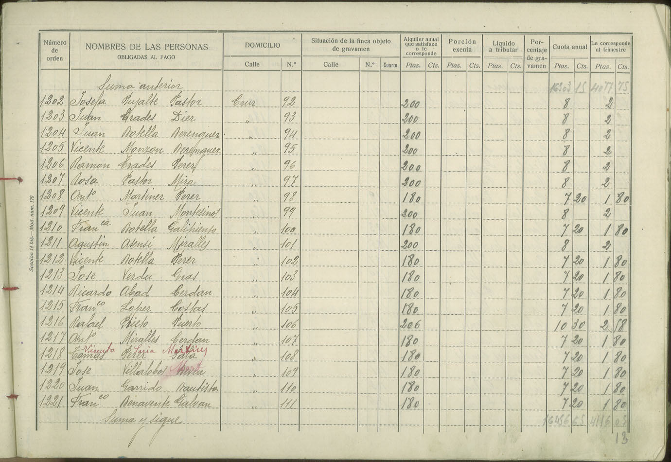 Padrón de personas sujetas al pago de arbitrio de inquilinato, 1927