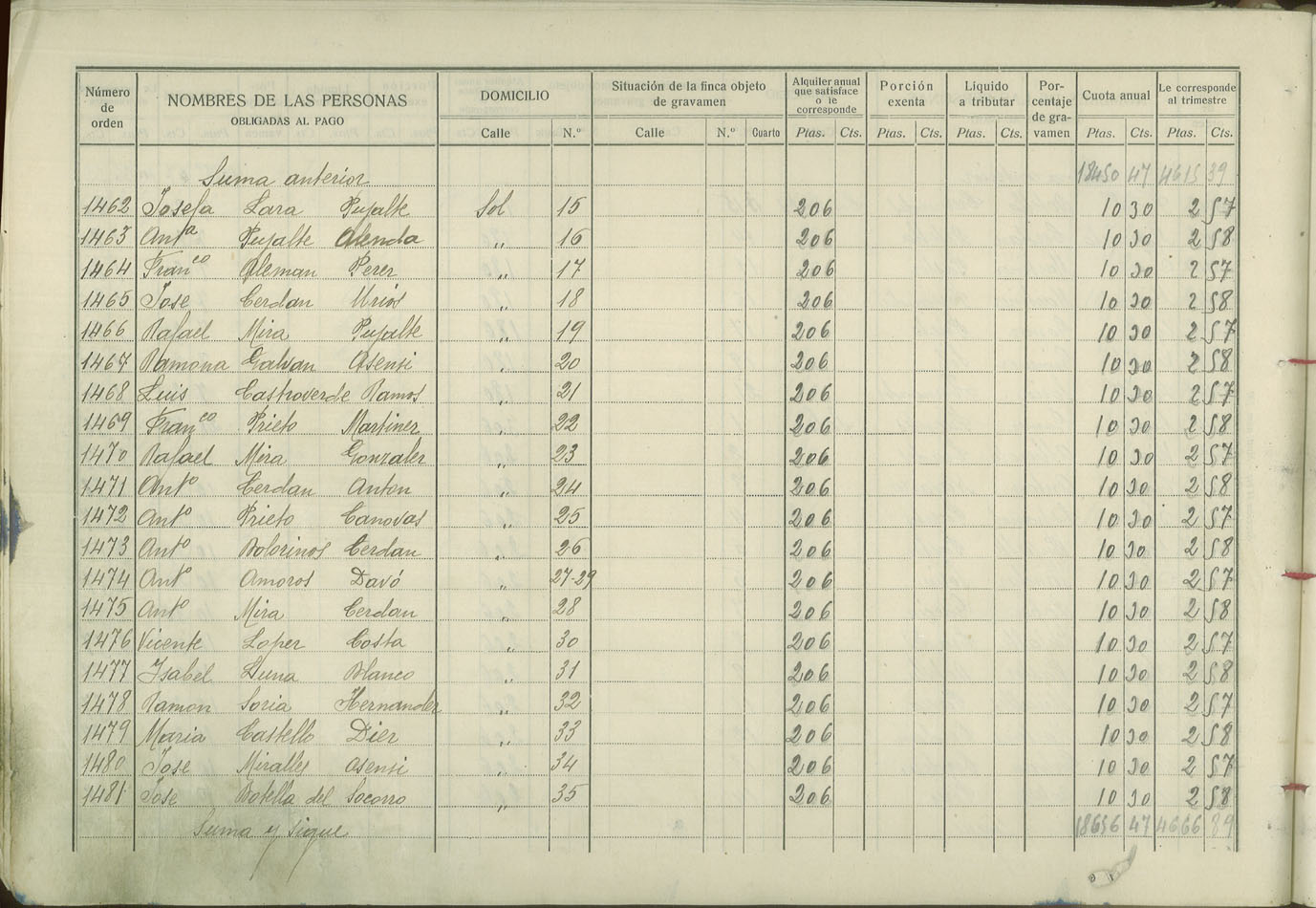 Padrón de personas sujetas al pago de arbitrio de inquilinato, 1927