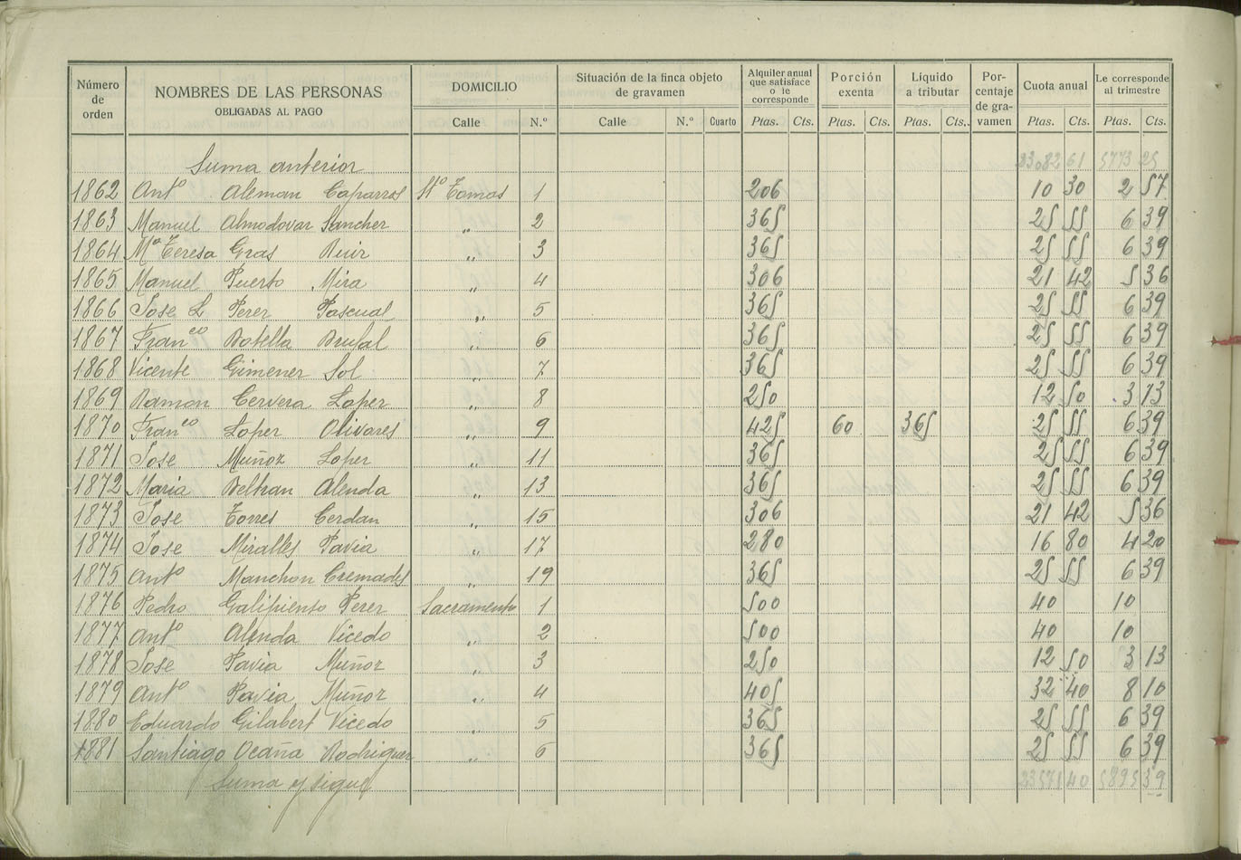 Padrón de personas sujetas al pago de arbitrio de inquilinato, 1927