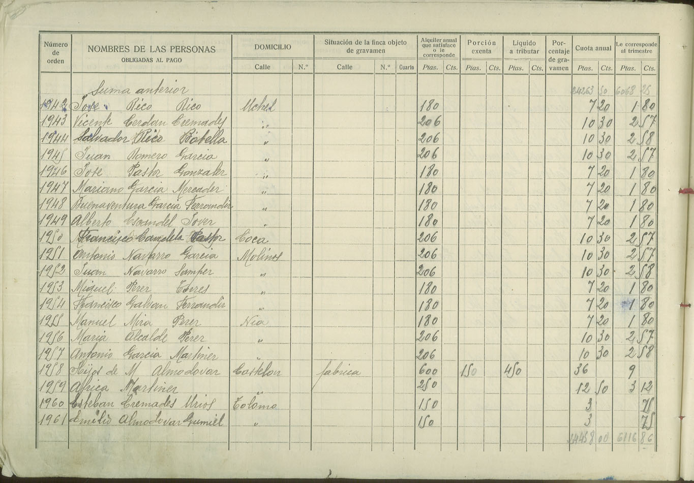 Padrón de personas sujetas al pago de arbitrio de inquilinato, 1927